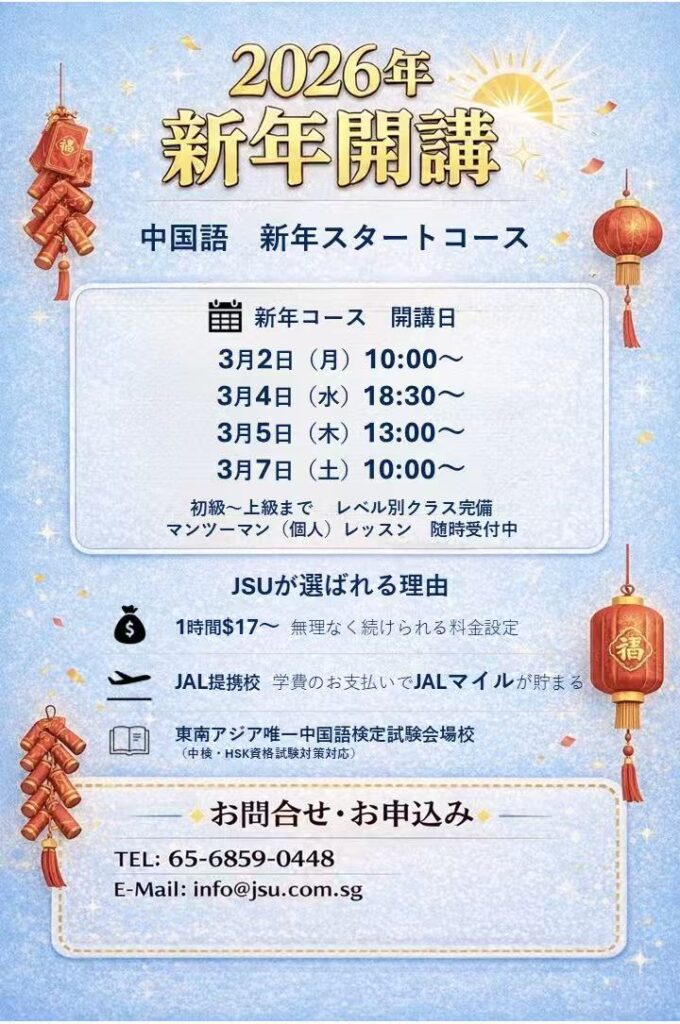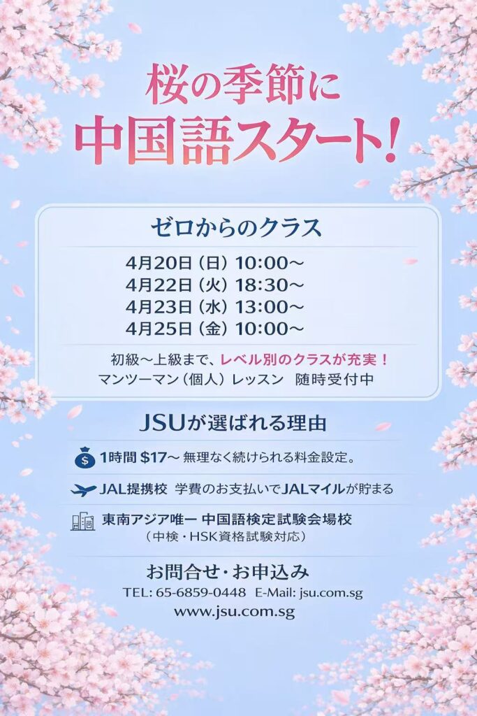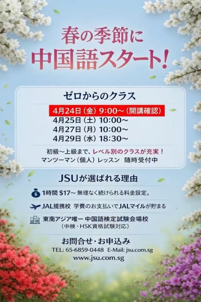 シンガポールで中国語を習いたい方、歴史あるJSUは本当にお勧めです。グループでも個人でも多忙なスケジュールの調整も可能です。是非クラスを覗いてみてください。